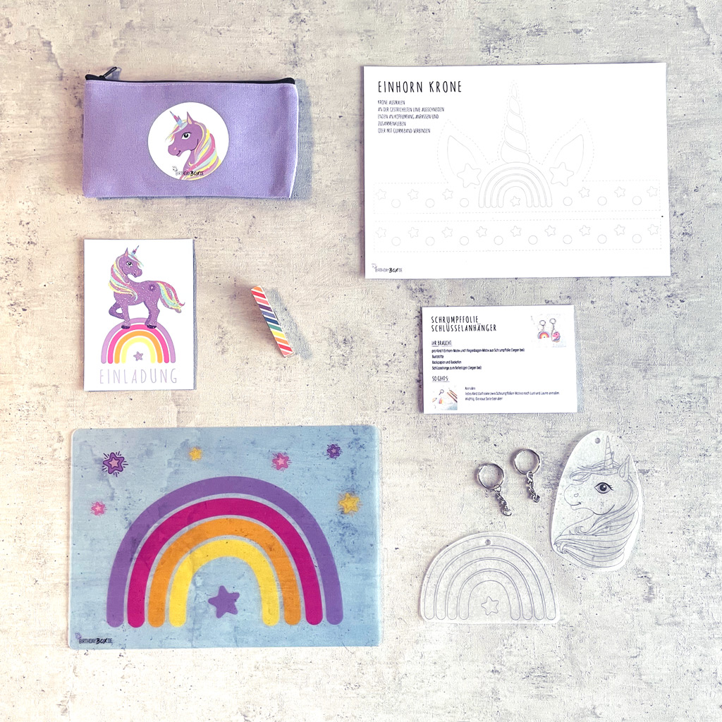 Ein kreatives Highlight! Jedes Kind bastelt seine eigenen Einhorn-Schlüsselanhänger – ein tolles Mitgebsel und schöne Erinnerung. Im Set enthalten: 2 Schrumpffolien-Motive pro Kind und passende Schlüsselringe.